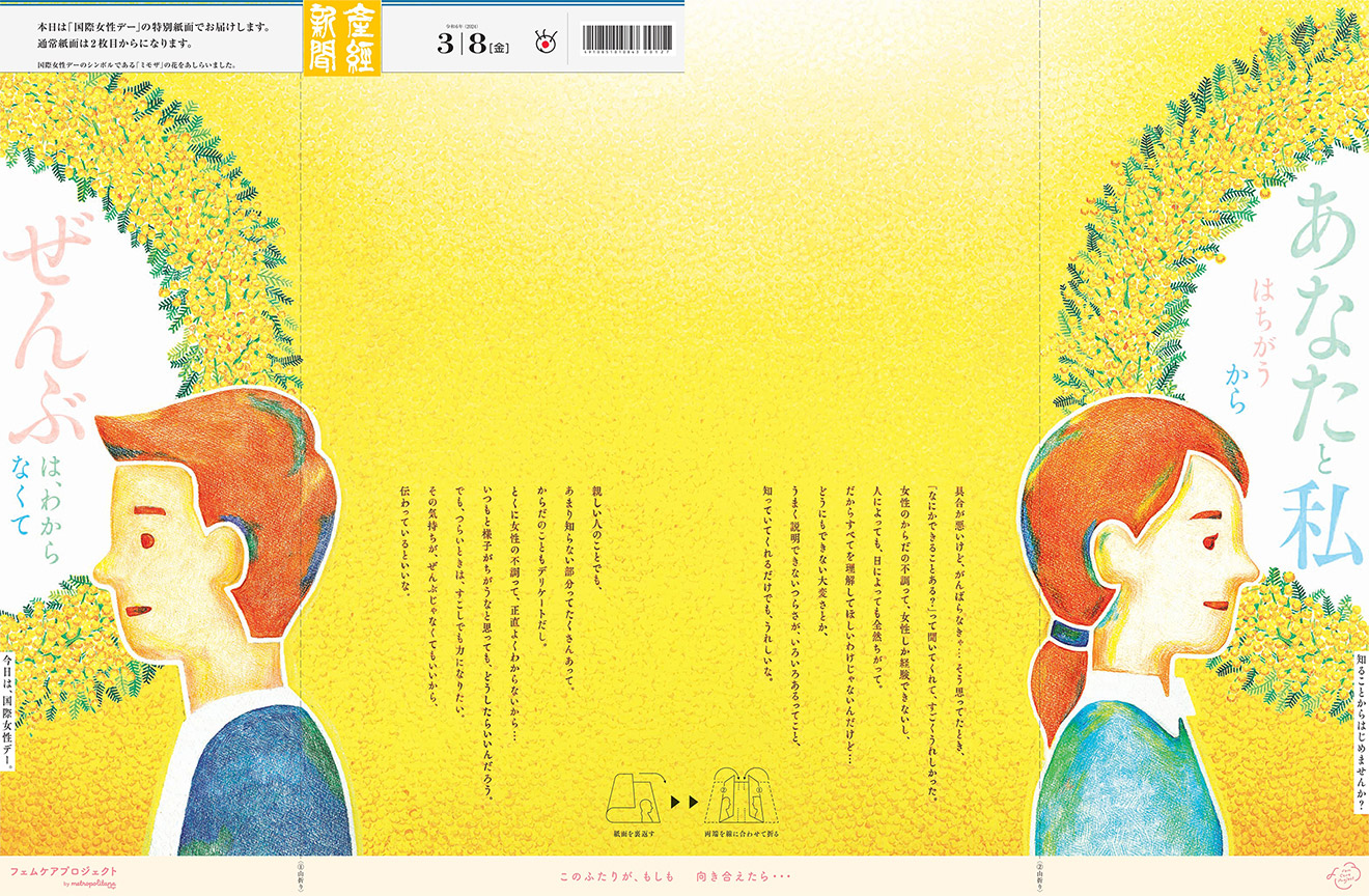 なかでも、山場となるのが、3月8日の「国際女性デー」です。24、25、26年は、3年連続で「産経新聞」を丸ごと包むフルラッピングの特別紙面を展開し、読者に広くメッセージを発信しました。24年(画像上)、25年(同下)ではいずれも「対話」や「相互理解」の大切さを訴え、女性を含む誰もが活躍する社会の実現を求める気持ちを込めました。この取り組みは大きな反響を呼び、2年連続、日本新聞協会の「新聞広告賞」を受賞しました。